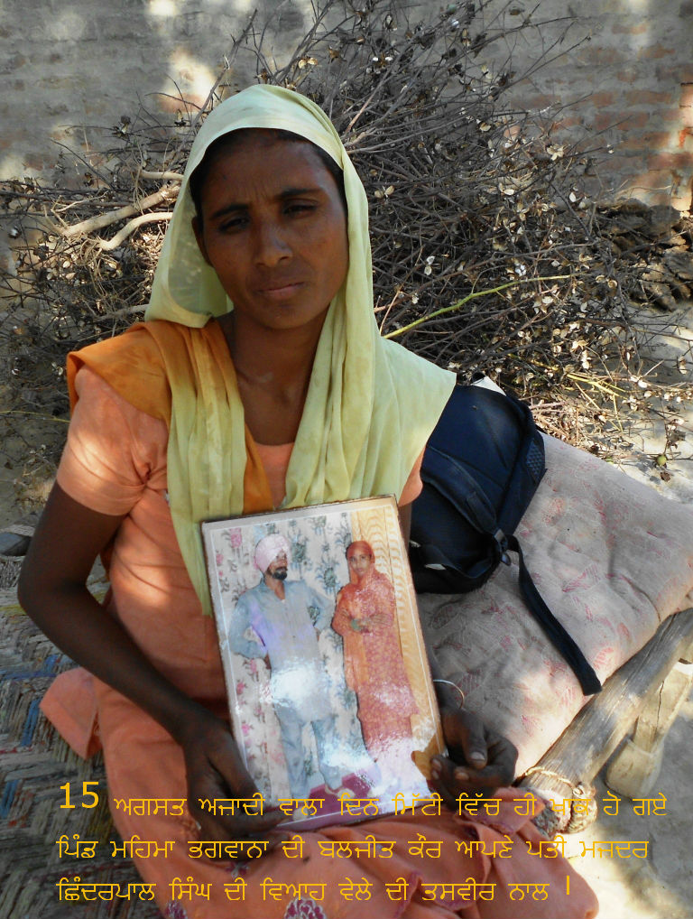 ਭਾਰਤ ਦੀ ਅਜ਼ਾਦੀ ਵਾਲੇ ਦਿਨ ਜਦੋਂ ਦੇਸ਼ ਭਰ ਵਿੱਚ ਸੁਤੰਤਰਾ ਦੇ ਜਸ਼ਨ ਮਨਾਏ ਜਾ ਰਹੇ ਤਾਂ 15 ਅਗਸਤ 2010 ਨੂੰ ਪਿੰਡ ਮਹਿਮਾ ਭਗਵਾਨਾ ਦੇ ਦੋ ਖ਼ੇਤਾਂ ਦੇ ਪੁੱਤਾਂ ਨੂੰ ਮਿੱਟੀ ਨੇ ਸਦਾ ਲਈ ਹੀ ਦਫ਼ਨਾ ਲਿਆ, ਪਿੰਡ ਵਿੱਚ ਵੈਣਾਂ ਤੋਂ ਬਿਨਾਂ ਕੁਝ ਨਹੀਂ ਸੀ ਸੁਣ ਰਿਹਾ। ਮਰ ਚੁੱਕੇ ਮਜ਼ਦੂਰ ਦੇ ਘਰ ਭੁੱਖ ਨੰਗ ਵਾਲੀ ਹਾਲਤ ਹੈ ਜਦੋਂ ਕਿ ਉਸ ਦੇ ਨਾਲ ਹੀ ਦਫ਼ਨ ਹੋਣ ਵਾਲੇ ਕਿਸਾਨ ਨੌਜਵਾਨ ਲੜਕਾ ਨੇ ਕੁਝ ਦਿਨ ਬਾਅਦ ਹੀ ਆਸਟ੍ਰੇਲੀਆ ਜਾਣਾ ਸੀ। ਪਿੰਡ ਦੇ ਕਿਸਾਨ ਬਘੇਲ ਸਿੰਘ ਦੇ ਖ਼ੇਤਾਂ ਵਿੱਚ ਟਿਊਬਵੈੱਲ ਵਾਲਾ ਬੋਰ ਪੱਕਾ ਕਰਨ ਲਈ ਉਸ ਦਾ ਕੁਆਰਾ ਨੌਜਵਾਨ ਬੇਟਾ ਸਤਵਿੰਦਰ ਸਿੰਘ ਤੇ ਇਸੇ ਪਿੰਡ ਦਾ ਕਿਰਤੀ ਛਿੰਦਰਪਾਲ ਸਿੰਘ ਨੂੰ ਮਿੱਟੀ ਦੀਆਂ ਢਿੱਗਾਂ ਨੇ ਆਪਣੇ ਵਿੱਚ ਹੀ ਸਦਾ ਲਈ ਸਮੋ ਲਿਆ। ਦਰਮਿਆਨੀ ਕਿਸਾਨੀ ਵਿੱਚੋਂ ਘਰ ਦੀ ਮਾੜੀ ਹਾਲਤ ਨੂੰ ਬੇਹਤਰ ਬਣਾਉਂਣ ਲਈ 20 ਸਾਲ ਦੇ ਸਤਵਿੰਦਰ ਸਿੰਘ ਗੌਰੀ ਨੇ 10+2 ਮਗਰੋਂ ਆਸਟਰੇਲੀਆ ਵਿੱਚ ਪੜਾਈ ਲਈ ਜਾਣ ਖਾਤਰ ਆਈਲੇਟਸ 6 ਪੁਆਇੰਟਸ ਨਾਲ ਕੀਤੀ ਉਸ ਨੇ ਕੁਝ ਦਿਨ ਬਾਅਦ ਹੀ ਜਹਾਜ਼ ਚੜਨਾ ਸੀ ਪਰ ਇਸ ਮੰਦਭਾਗੀ ਘਟਨਾ ਨੇ ਪਰਿਵਾਰ ਦੇ ਸਾਰੇ ਸੁਪਨੇ ਹੀ ਮਿੱਟੀ ਕਰ ਦਿੱਤੇ, ਗੌਰੀ ਦੇ ਜਾਣ ਲਈ ਏਜੰਟ ਨੂੰ 6 ਲੱਖ ਰੁਪਏ ਵੀ ਕਰਜ਼ਾ ਲੈ ਕੇ ਹੀ ਦਿੱਤਾ ਸੀ, ਇਸ ਘਟਨਾ ਤੋਂ ਮਗਰੋਂ ਏਜੰਟ ਉਸ ਦੇ ਤੇ ਉਸ ਦੇ ਦੂਜੇ ਸਾਥੀਆਂ ਦੇ ਰੁਪਏ ਲੈ ਕੇ ਫਰਾਰ ਹੋ ਗਿਆ। ਗੱਲ ਛੇੜਨ ’ਤੇ ਸਤਵਿੰਦਰ ਸਿੰਘ ਦੀ ਮਾਂ ਬਲਵਿੰਦਰ ਕੌਰ ਧਾਹਾਂ ਮਾਰ ਕੇ ਰੋਂਦੀ ਕਹਿੰਦੀ ਹੈ, ‘‘ਪੁੱਤ ਗੌਰੀ ਤੂੰ ਕਿਤੇ ਨੀ ਆਉਂਣਾ, ਤੂੰ ਸਾਰੀ ਉਮਰ ਲਈ ਸਾਨੂੰ ਤੜਫਤਾ ਛੱਡ ਕੇ ਜਾ ਵੜਿਆ।’’ ਉਸ ਦੇ ਹਾਉਂਕੇ, ਹੰਝੂ, ਦਰਦ, ਭਾਵਨਾਵਾਂ ਮਿੱਟੀ ਵਿੱਚ ਦੱਬ ਕੇ ਰਹਿ ਜਾਂਦੀਆਂ ਹਨ। ਟੁੱਟੇ ਜਿਹੇ ਸਾਇਕਲ ’ਤੇ ਖ਼ਾਦ ਦੀਆਂ ਬੋਰੀਆਂ ਚੁੱਕੀ ਆਉਂਦੇ ਗੋਰੀ ਦੇ ਭਰਾ ਦੀ ਆਰਥਿਕ ਹਾਲਤ ਮੂੰਹ ਬੋਲਦੀ ਤਸਵੀਰ ਹੈ। ਛੋਟੀ ਉਮਰ ਦੀ ਬਲਜੀਤ ਕੌਰ ਆਪਣੇ ਬਲ ਨਾਲ ਜਿੱਤਣ ਦੀ ਬਜਾਏ ਹਾਰ ਮੰਨ ਚੁੱਕੀ ਹੈ। ਉਹ ਨੂੰ ਮੁਸੀਬਤਾਂ ਤੇ ਗਰੀਬ ਨੇ ਬੁੱਢੀ ਜਿਹੀ ਹੀ ਬਣਾ ਦਿੱਤਾ। ਉਸ ਦੇ ਪਤੀ ਛਿੰਦਰਪਾਲ ਸਿੰਘ ਦੇ ਮਿੱਟੀ ਹੇਠ ਆ ਕੇ ਮੌਤ ਹੋ ਜਾਣ ਮਗਰੋਂ ਉਹ ਲੱਖ਼ਾਂ ਰੁਪਏ ਦੇ ਕਰਜ਼ੇ ਦੇ ਜਾਲ ਵਿੱਚ ਫ਼ਸ ਕੇ ਰਹਿ ਗਈ, ਉਸ ਦੇ 6 ਬੱਚਿਆਂ ਦੀ ਹਾਲਤ ਅਤਿ ਤਰਸਯੋਗ ਹੈ ਜੋ ਕਿ ਆਪਣਾ ਪੇਟ ਪਾਲਣ ਲਈ ਛੋਟੀ-ਮੋਟੀ ਦਿਹਾੜੀ ਕਰਦੇ ਹਨ, ਦੋ ਬੇਟੀਆਂ ਕਿਸਾਨਾਂ ਦਾ ਗੋਹਾ ਕੂੜਾ ਕਰਦੀਆਂ ਹਨ, ਬਲਜੀਤ ਕੌਰ ਦਾ ਗਿਲਾ ਕੇ ਉਸ ਨੂੰ ਇੱਕ ਪੈਸ਼ੇ ਦੀ ਵੀ ਸਰਕਾਰੀ ਮੱਦਦ ਨਹੀਂ ਮਿਲੀ। ਨਜ਼ਦੀਕੀ ਪਿੰਡ ਮਹਿਮਾ ਸਰਜਾ ਵਿੱਚ ਵੀ ਕੁਝ ਸਾਲ ਪਹਿਲਾ ਫ਼ਰੀਦਕੋਟ ਜਿਲੇ ਦੇ ਪਿੰਡ ਰਣ ਸਿੰਘ ਵਾਲਾ ਤੋਂ ਆਪਣੀ ਭੈਣ ਦੇ ਘਰ ਮਿਲਣ ਆਇਆ ਕੁਲਵੰਤ ਸਿੰਘ ਆਪਣੇ ਭਾਣਜੇ ਦੇ ਖ਼ੇਤ ਸਥਿਤ ਪੁਰਾਣੇ ਖ਼ੂਹ ਵਿੱਚੋਂ ਇੱਟਾਂ ਕੱਢਦੇ ਸਮੇਂ ਮਿੱਟੀ ਵਿੱਚ ਹੀ ਖ਼ਤਮ ਹੋ ਗਿਆ।