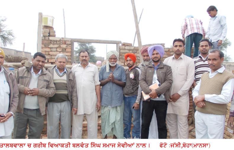 ਸਮਾਜ ਸੇਵੀਆਂ ਨੇ ਫੜੀ ਬਾਂਹ : ਸੱਤ ਦਹਾਕਿਆਂ ਤੋਂ ਹਾਸ਼ੀਏ ਦੀ ਜ਼ਿੰਦਗੀ ਬਸਰ ਕਰ ਰਹੇ ਬਲਵੰਤ ਸਿੰਘ ਦੇ ਵੇਹੜੇ ਚ ਕੁਝ ਸਮਾਜ ਸੇਵੀਆਂ ਨੇ ਪੁੱਜਕੇ ਉਸ ਦੀ ਦਾਸਤਾਂ ਜਾਣੀ ਅਤੇ ਸੰਗਤ ਦੇ ਸਹਿਯੋਗ ਨਾਲ ਜਿਥੇ ਕੁਝ ਪਲਾਂ ਚ ਹੀ ਮਕਾਨ ਤਿਆਰ ਕਰਕੇ ਦੇ ਦਿੱਤਾ ਉਥੇ ਬਲਵੰਤ ਸਿੰਘ ਦੇ ਸਨਮਾਨਯੋਗ ਗੁਜ਼ਾਰੇ ਲਈ ਮੰਜੇ-ਬਿਸਤਰੇ ਦਾ ਪ੍ਰਬੰਧ ਵੀ ਕੀਤਾ। ਇਸ ਮੌਕੇ ਪੱਤਰਕਾਰਾਂ ਨਾਲ ਗੱਲਬਾਤ ਕਰਦਿਆਂ ਸਮਾਜ ਸੇਵੀ ਮਾ.ਪ੍ਰੀਤਮ ਸਿੰਘ ਮੱਲ ਸਿੰਘ ਵਾਲਾ ਅਤੇ ਚੂਹੜ੍ਹ ਸਿੰਘ ਨੇ ਦੱਸਿਆ ਕਿ ਜਿਉਂ ਹੀ ਇਸ ਗ਼ਰੀਬ ਵਿਅਕਤੀ ਬਾਰੇ ਉਨ੍ਹਾਂ ਨੂੰ ਪਤਾ ਚੱਲਿਆ ਤਾਂ ਉਹ ਸਹਾਇਤਾ ਲਈ ਆ ਗਏ। ਉਨ੍ਹਾਂ ਇਹ ਵੀ ਕਿਹਾ ਕਿ ਸੰਸਥਾ ਵੱਲੋਂ ਅਜਿਹੇ 77 ਮਾਨਵਤਾ ਭਲਾਈ ਕਾਰਜ ਕੀਤੇ ਜਾ ਰਹੇ ਹਨ।